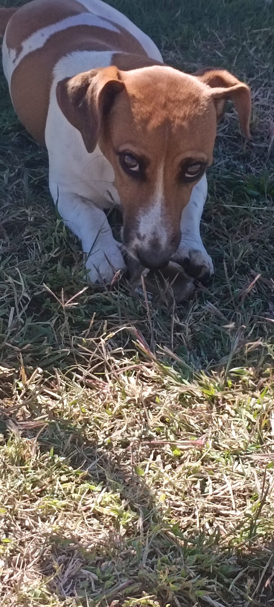 a 7-8 month old Jack Russell female. Your typical little terrier bouncing of the walls with energy. She does get along with most of the other dogs in fostercare. She will occasionally chase the cats but it is more curiosity. She loves being outside in the big garden but wants to snuggle with a human in a warm bed at night. She is not sterilised yet but will be prior to rehoming.